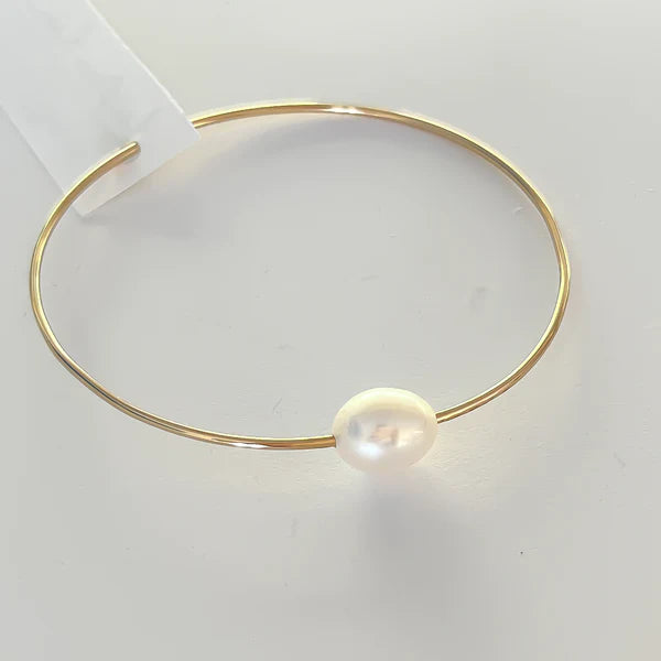 Stunning freshwater pearls on gold filled bangle. Unlike most bangles you find, our pearl does not slide around. This is one quality that makes them unique so that they sit on your wrist rather than the pearl falling to the bottom of your wrist.