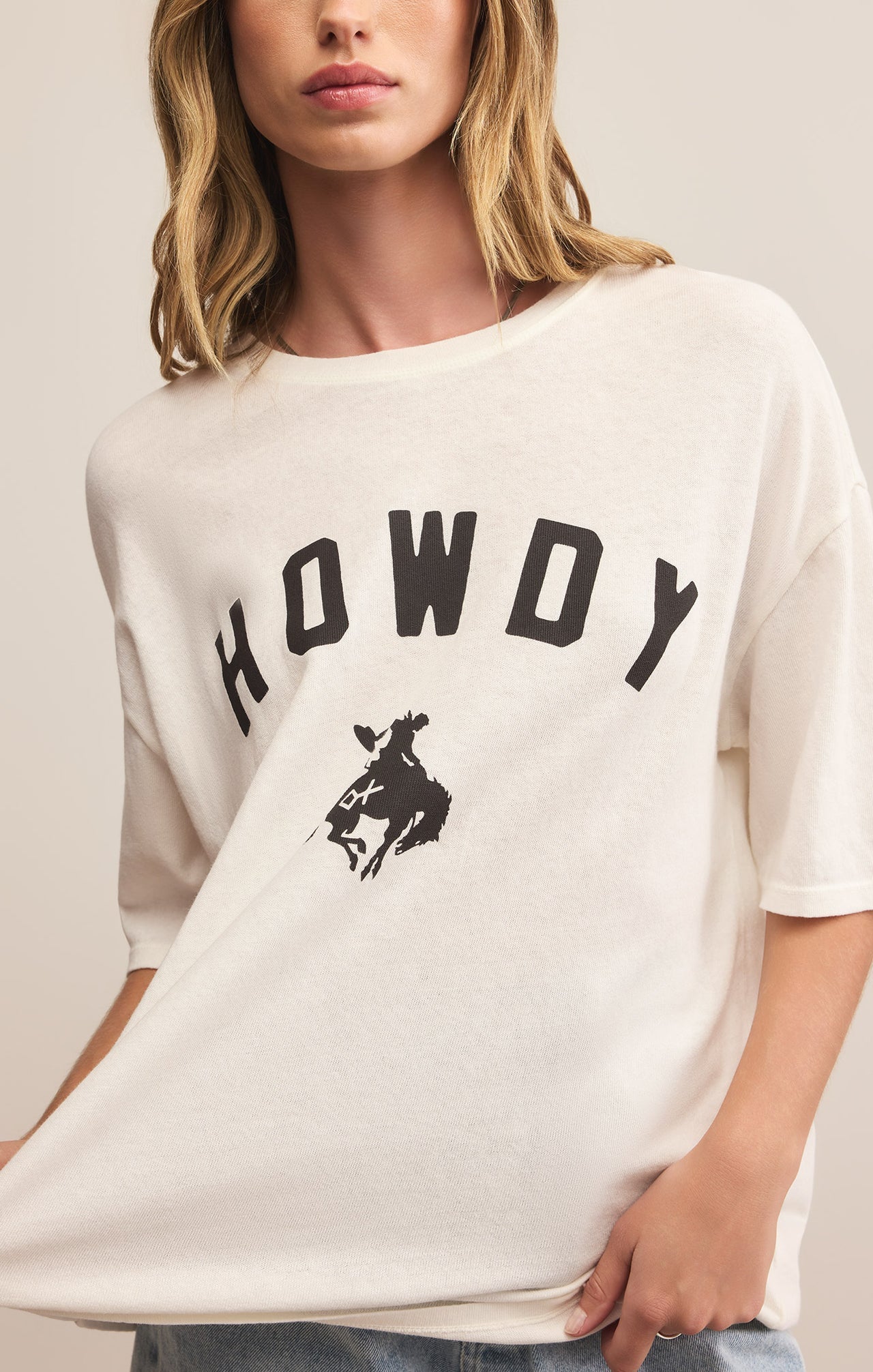 This oversized tee, part of an exclusive Z SUPPLY x Diamond Cross Ranch collaboration, channels effortless Western charm with a "Howdy" screen print and a bucking bronco graphic on the front and back. Made from 100% cotton loose knit jersey, it’s perfectly slouchy, ultra-soft, and ready to pair with your favorite denim for that lived-in, free-spirited feel.