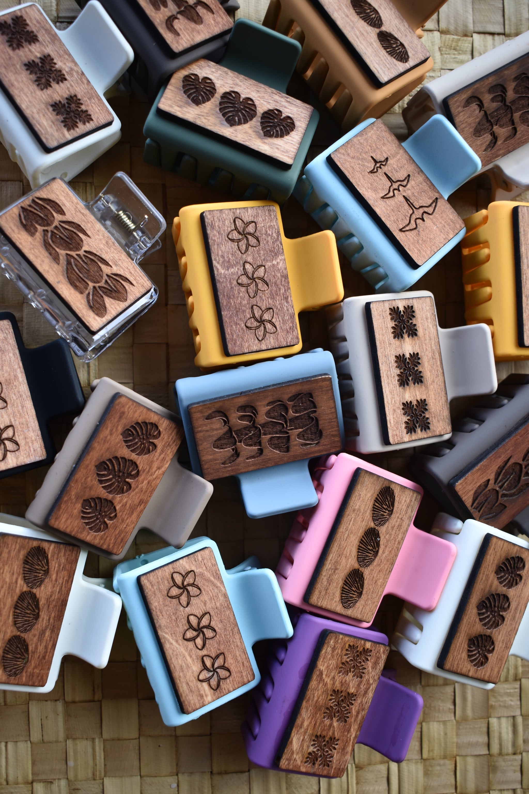 Handmade in Hawai'i, this beautiful claw clip comes in an assortment of styles/colors. From plumeria and monstera, to iwa birds and puakenikeni, these clips will bring the island flair to any look. Approximately 2". Made in Hawai'i. Due to the natural nature of this product, each clip is unique and wood stain/colors may vary.