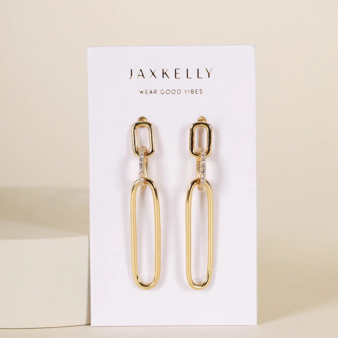 An elevated take on your favorite chain link earring. Three hoops centered with white pave stones. Tarnish Free - Long lasting protective coating safeguarding your jewelry from sweat, water, and more. Sterling Silver Posts – 18K gold plating over brass Hypoallergenic – Lead Free White pave CZ stones in the middle rung The earring measures 37mm x 5mm
